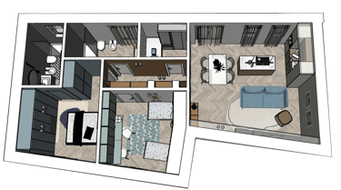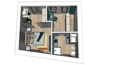 Ampio trilocale con zona giorno open, camera matrimoniale e camera doppia, due bagni e locale ripostiglio/lavanderia.