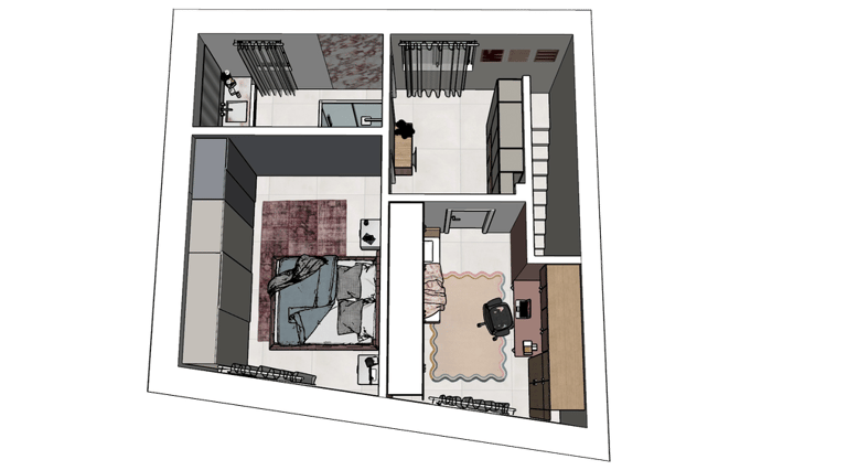 Piano superiore: Camera matrimoniale, cameretta, bagno e spazi accessori